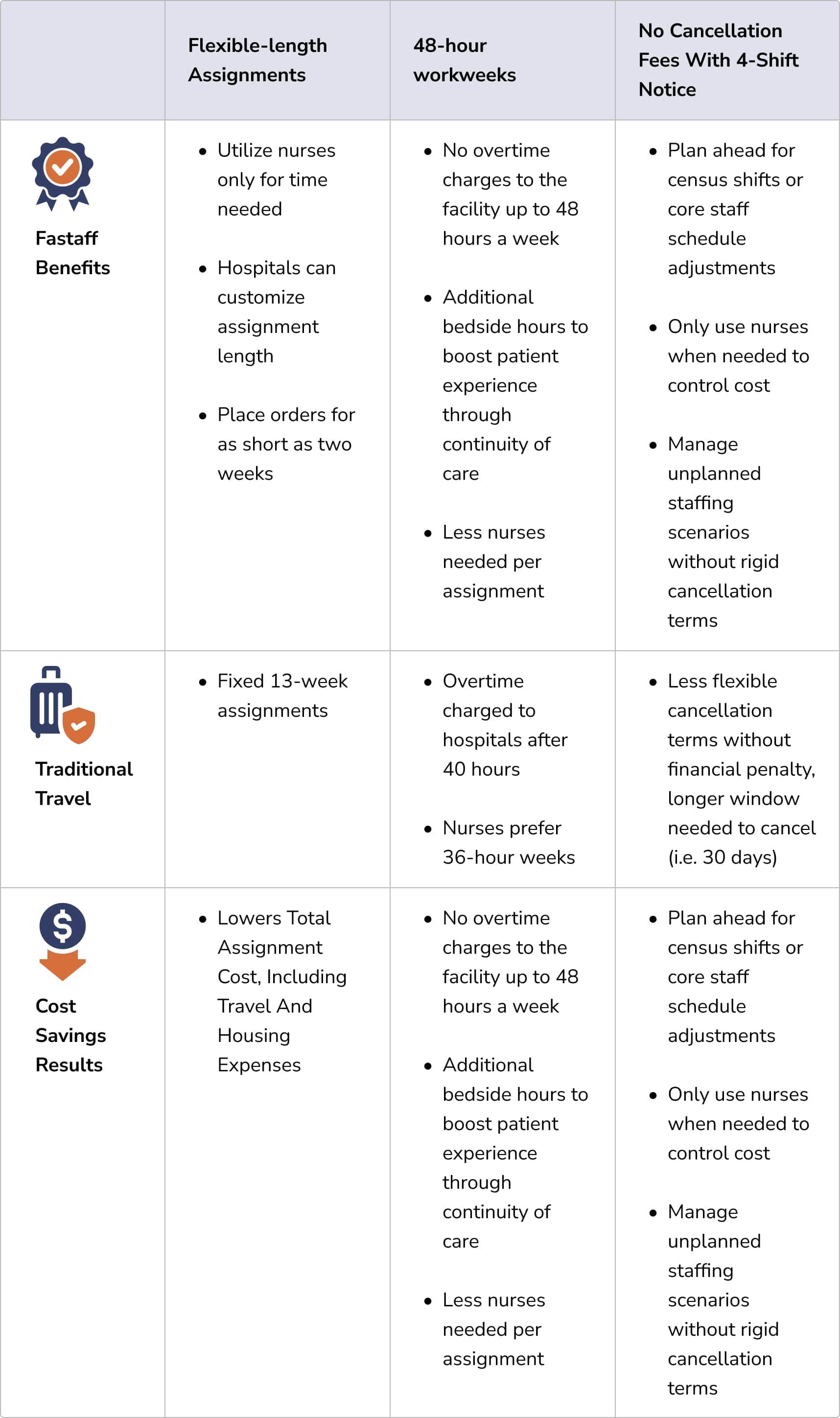 Fastaff’s unique approach to Operational Flexibility results in cost savings and optimal nurse utilization through the features in the table below.